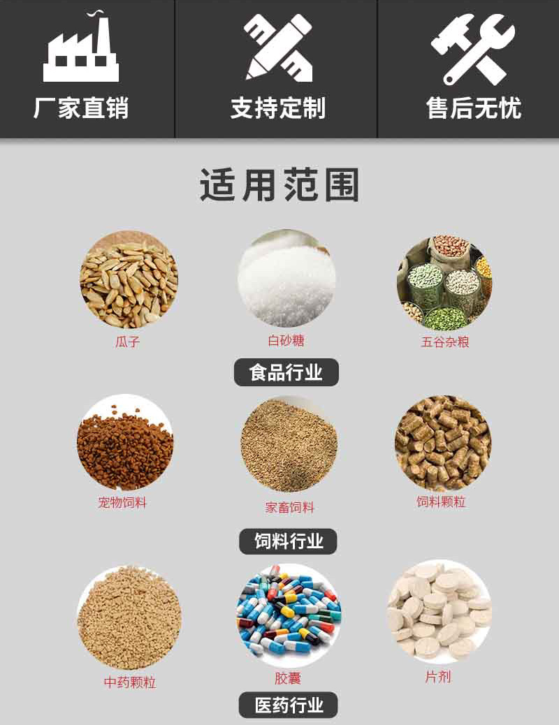 【物料要求】:顆粒度物料,如食品,化工,建筑類物料原料